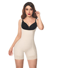 No hay nada mejor tengas una prenda aliada en tu proceso de recuperación, el diseño de esta prenda es espectacular, cuenta doble refuerzo abdominal y cremallera invisible lateral con broches internos de una posición que hacen que tu zona abdominal tenga una compresión adecuada para darle forma a tu silueta, tiene tiras expandibles y cuenta con una cobertura amplia en la zona de la espalda tapando los rollitos que se hacen a los lados del brasier. En la parte de la media pierna tu piel hará contacto con un suave encaje siliconado que evitará que se enrolle y también un protector perineal para mayor facilidad y rapidez a la hora de ir al baño.  La zona de los glúteos y caderas es amplia ayudando a dar forma y lo más importante, si te hiciste lipo transferencia o te pusiste implantes, este tipo de glúteo te ayudará a que esa forma redonda y grande quede, no los aplasta .