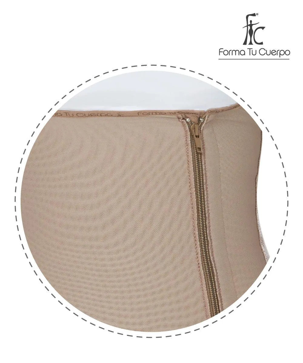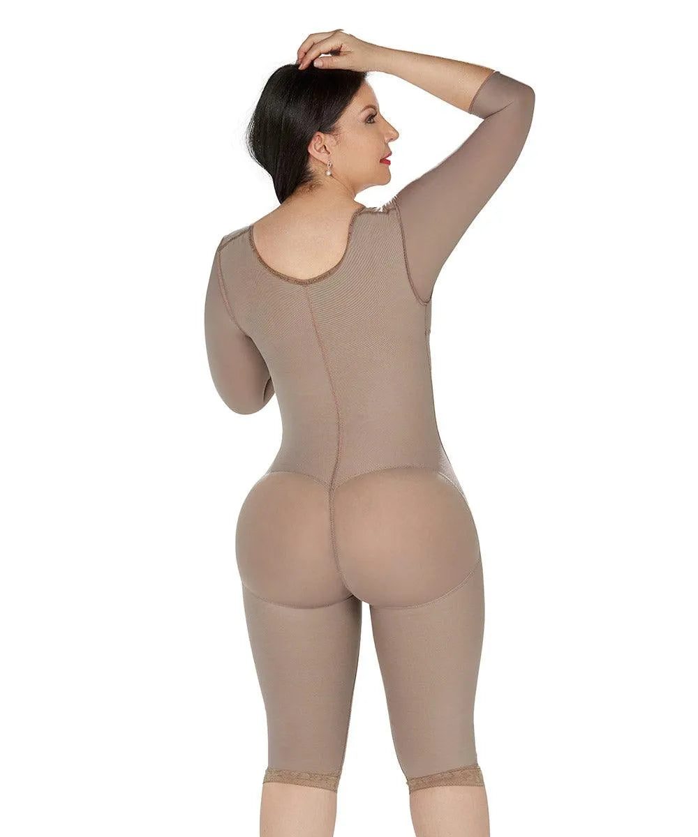 Nuestra Faja Rodilla Tira Ancha, es una prenda que moldea casi todo el cuerpo y por su diseño y espalda semi descubierta es ideal para usar con pantalones, faldas, blusas pequeñas y en general se ajusta a casi todo tipo de ropa. Está hecha con Power Net y Lycra de alta calidad, con triple refuerzo abdominal. Sus costuras planas la hacen prácticamente invisible y notablemente cómoda. Faja Rodilla con Mangas: - Doble refuerzo abdominal. - Costuras planas de alta comodidad. - Diseño con definición de cintura. - Levanta Cola "Pompis". - Broche inferior para ir baño con comodidad.